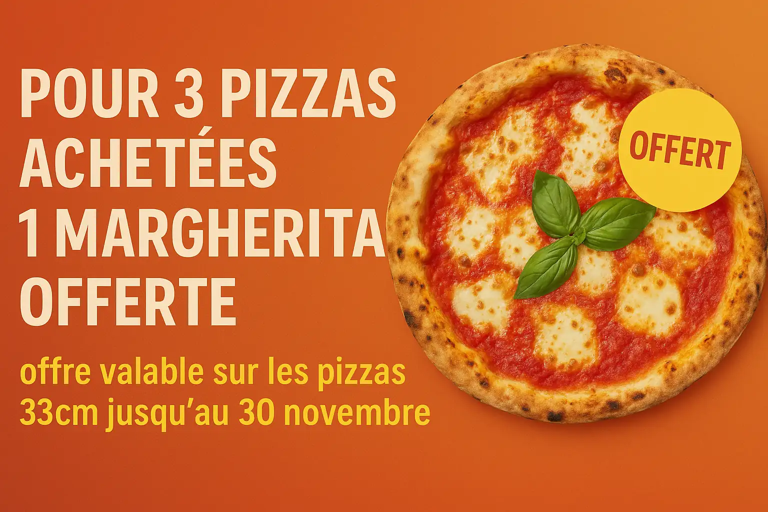 Et parce que nous savons que les temps sont durs, nous vous proposons également notre formule « 2 pizzas 33cm pour 12 € » (Uniquement à emporter sur une sélection de pizzas.)